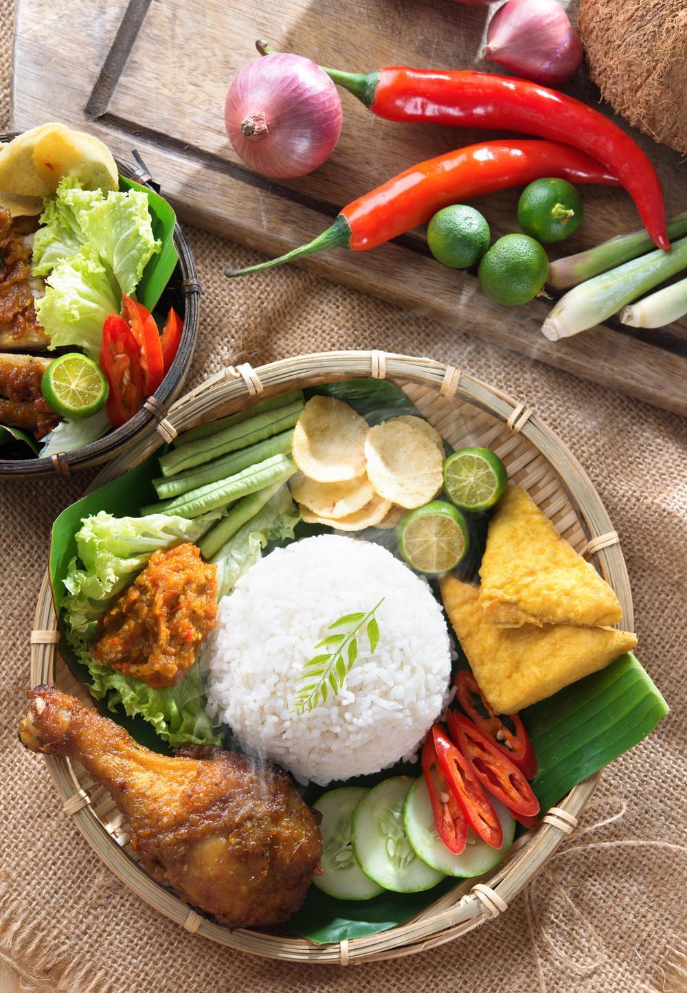 Geserveerd met 1 basisgerecht, 2 kip-vleesgerechten, 2 soorten groenten, 1 ei en 2 stokjes saté